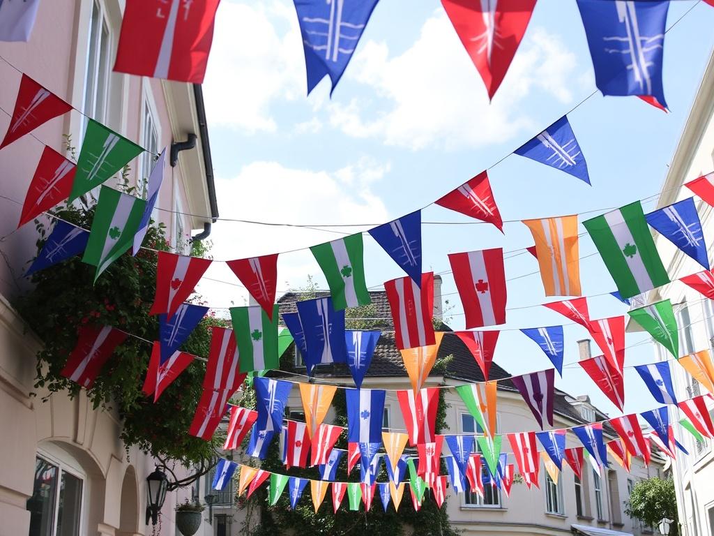 Малые флажки на веревке — классический прием уличных праздников. Они недороги, просты в установке и создают атмосферу праздника без серьезных вложений.